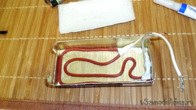 Укладываем поверх нагревателя теплоизоляционный материал чтобы направить поток тепла на алюминиевый кожух и не греть сам корпус повербанка.