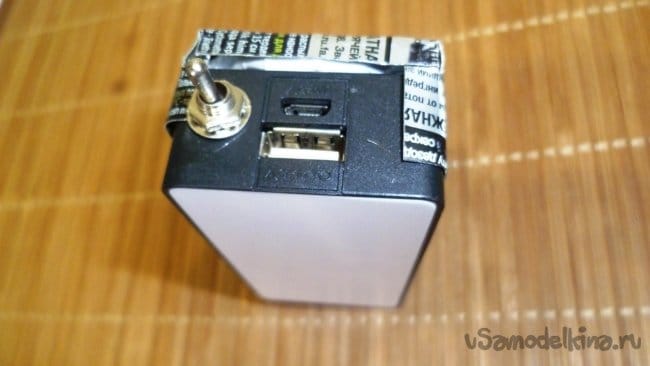В качестве выключателя фонаря применим тактильную кнопку. Ее также приклеиваем к боковой поверхности корпуса повербанка.