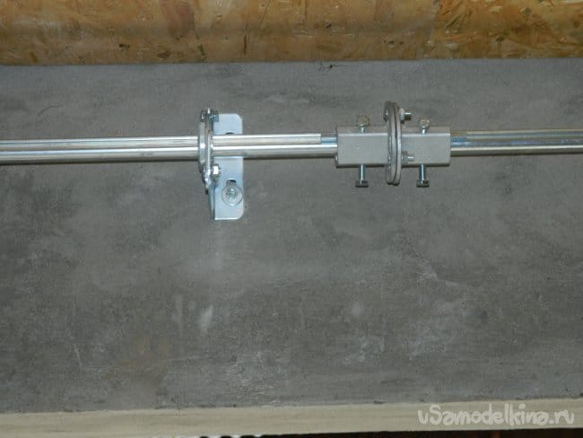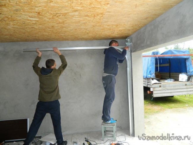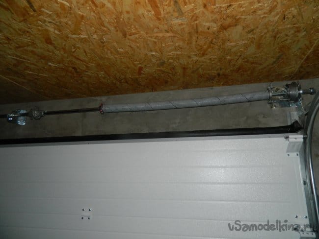 Чтобы дверь вывесить дверь в любом состоянии, были установлены две торсионные пружины с барабанами под 4-х мм тросик, который крепился к верхней панели.