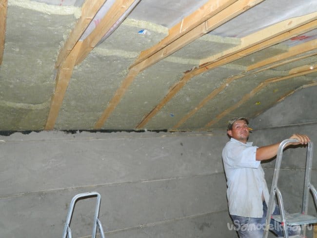 Следующим летом я начал отделку комнаты второго этажа в гараже. Поставил себе задачу — максимально утеплить комнату. Для этого необходимо утеплить потолок, щитовую перегородку и пол.