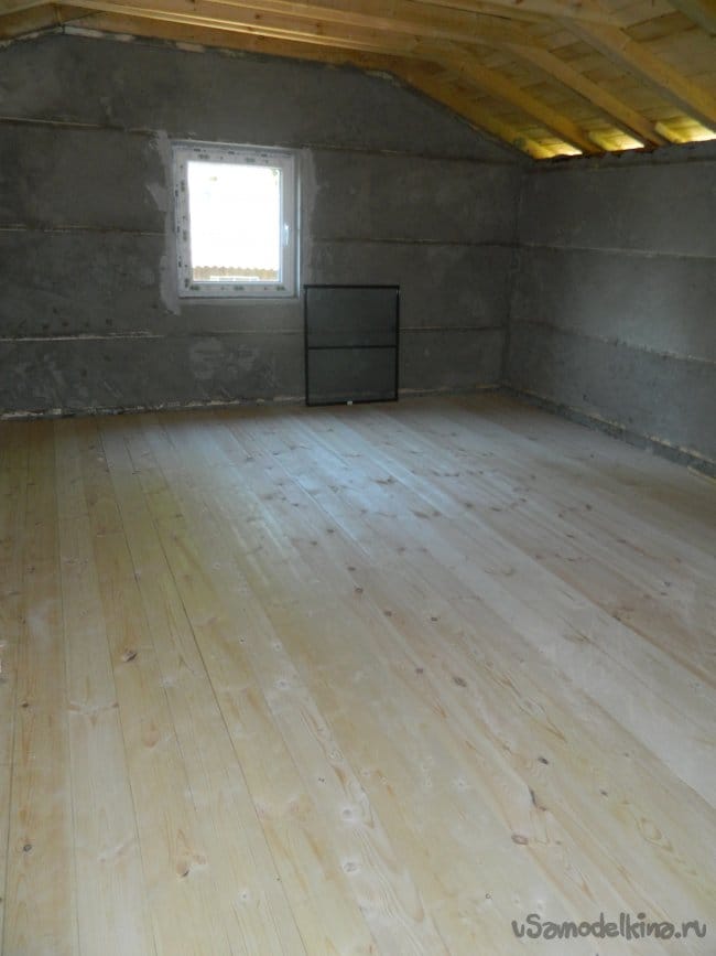 Для пола были закуплены 6-м половые доски сечением 135х36 мм. Снизу лаг уже был настелен изоспан при изготовлении чернового пола, который одновременно являлся потолком первого этажа гаража.