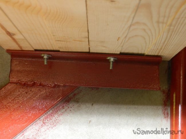 Наверху была сварена площадка из 65-го уголка, которая крепилась к стенам шпильками М10 насквозь, а к торцевому брусу — анкерами.