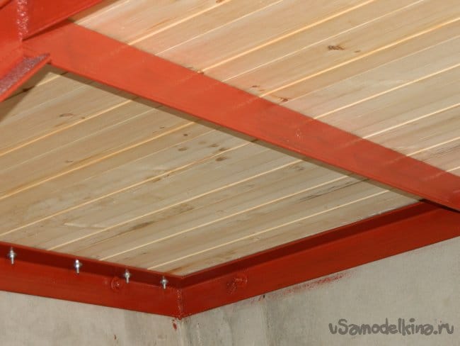 Доски пришивались саморезами по дереву. Так как потолок должен быть окрашен, они не будут заметны. Стыки были зашиты уголком 40х40 мм и плинтусом 40х40 мм.