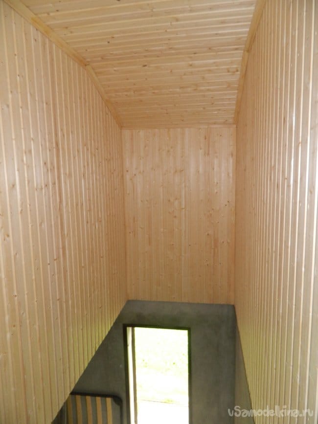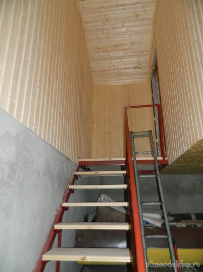 Вагонкой (Карелия, класса А) рабочим сечением 95х12 мм делалась обшивка потолка и стен в районе лестницы.