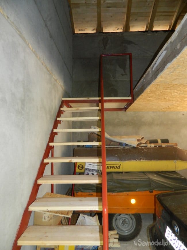 Потом необходимо было сделать лестницу на второй этаж. В качестве тетивы купил два 80-х швеллера, для опор — водопроводную трубу 1½″.
