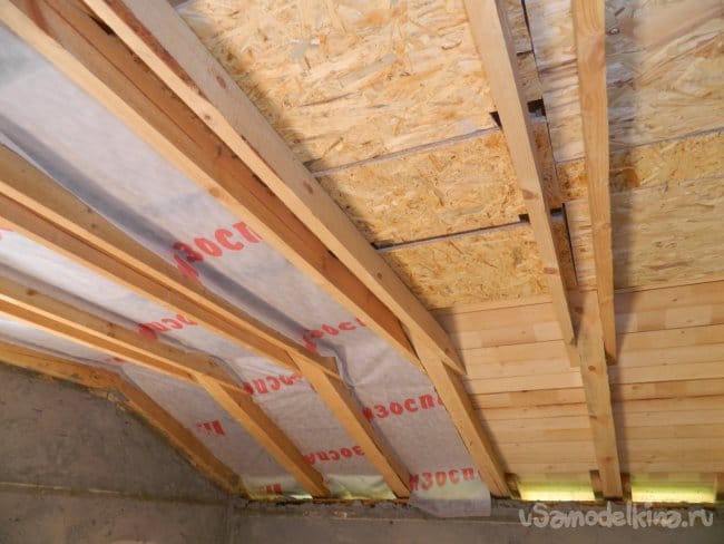 Далее занялся жилой комнатой, а точнее, её отделкой. Для чернового потолка использовалось 12-мм ОСП. Потом он был простелен изоспаном, как пароизоляцией.