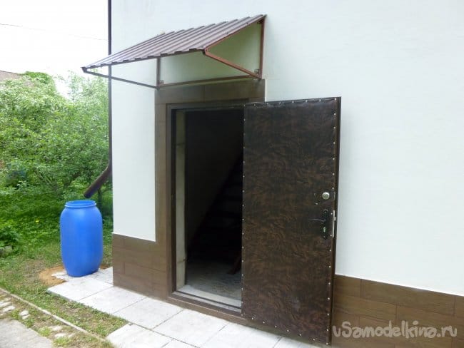 Козырёк для входной двери я сварил ещё в прошлом году, поэтому его оставалось только установить. Он был закреплён на сквозные шпильки М10 с гайками и шайбами в пяти местах — 3 сверху и 2 снизу.