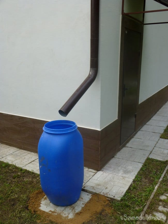 После укладки керамогранита на задней стенке и с боков, они были покрашены фасадной краской с мраморной крошкой, как очень стойкой к атмосферным осадкам (по совету продавца из Леруа в г. Пушкино, хоть и дорого!), и окончательно установлены сливы, под которые были куплены бочки. Чтобы не нагружать отмостку, бочки были установлены отдельно на тротуарные плитки, которые остались с прошлого года от отмостки, лежащие на песчаных подушках.