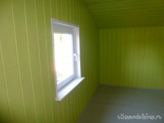 На совете с женой решили, что стены и потолок должны быть фисташкового цвета, пол — светло-серый, а окно, подоконник и наличники — белыми.