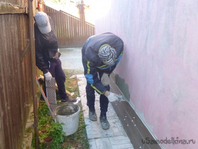 Керамогранит использовался итальянский марки Arrezo (по совету продавца из Касторамы в г. Щёлково) размерами 600х150х10 мм, поэтому его укладывали в 4 ряда (высота 600 мм), чтобы защитить цоколь от воды.
