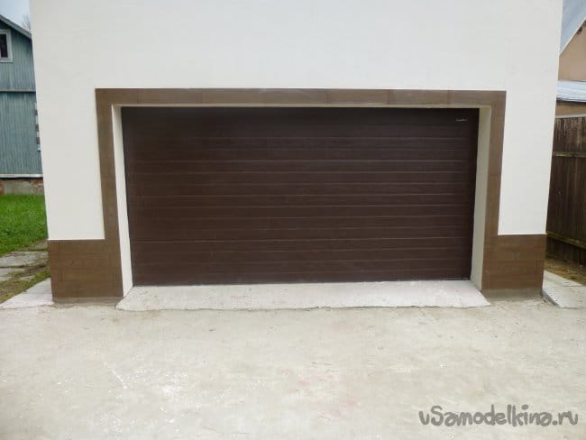 Затем занялись собственно фасадом. Вокруг ворот также был положен керамогранит, и фасад покрашен.