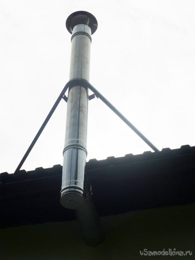 В трубе предусмотрена заслонка. Снаружи труба прочно прикреплена к крыше трубой 20х20х1,5 мм.