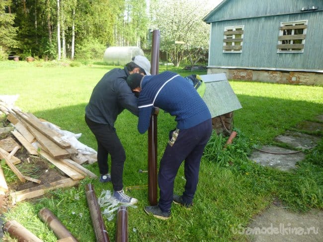 Начали с установки сливов с крыши.