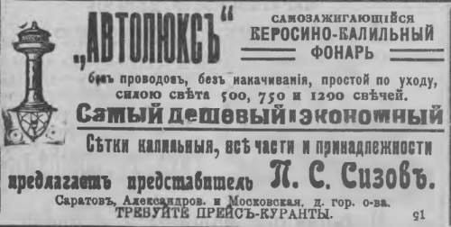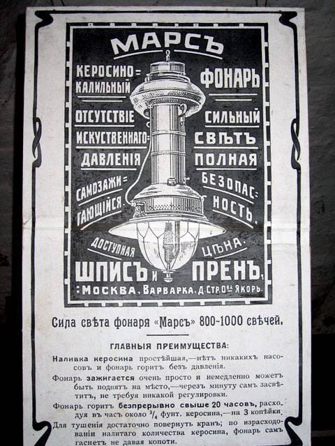 К слову о мощности. Мощность этих осветительных приборов традиционно измеряется в такой единице как cp - candlepower (candl - свеча, power - мощность). У нас в то время эта единица называлась просто — свеча. Так что надписи "сила света в 1000 свечей" на дореволюционных листовках является не что иное, как самые настоящие технические характеристики.