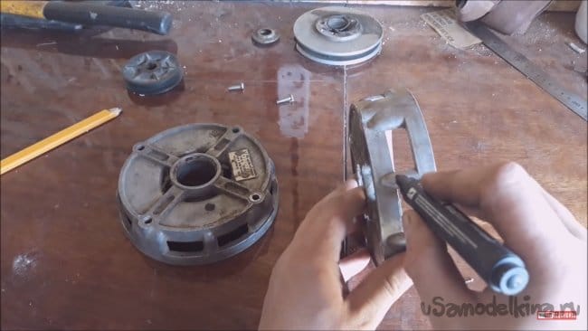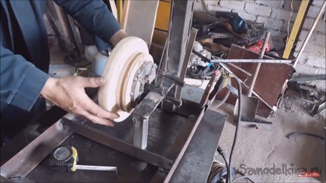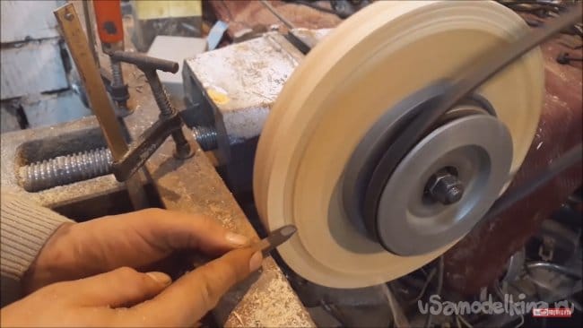 Просверлил отверстие и прикрутил его к крышке. Потом взял ось, зажал её в тиски, на эту ось одел колесо. Привод осуществлялся полировочной машинкой через ремень, на которую также был установлен шкив. Соорудил импровизированный подручник. Из старого напильника изготовил резец, и подбирая обороты, благо они регулируются, потихоньку выровнял сие чудо. Из квадратного напильника готовил резец по профилю ремня, и в нижнем колесе проточил канавку под ремень. Таким же способом обработал верхнее колесо. Здесь есть один нюанс. Плоскость, по которой будет бегать лента, должна быть полукруглой. Это поможет лучше удерживать ленту, а также предотвратит её сбегание с торца колеса. Когда колёса будут изготовлены и обработаны, можно приступить к изготовлению рамы.