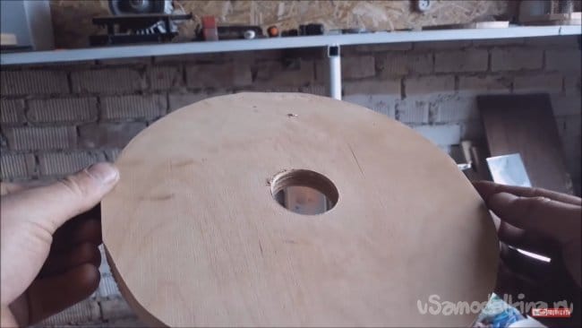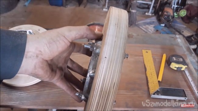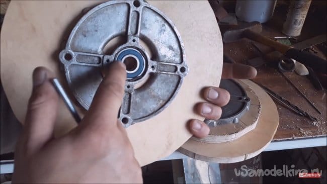 Дальше нам понадобится боковые крышки от двигателей старых стиральных машин. Они будут служить корпусами подшипников. Отрезаем всё лишнее как показано на фото. В дисках коронкой на 40 делаем центральные отверстия. Далее складываем наш пакет, по бокам устанавливаем крышки и дрелью сверлим 4 отверстия. Все фанерные диски хотел сначала склеить, но потом подумал, что это будет лишним и стяжка на 4 шпильки М8 даст неплохую жесткость. Такую же процедуру нужно повторить и с верхним колесом. В принципе колёса готовы, но есть один нюанс. Они жутко кривые и очень сильно бьют. Долго думал, как их выровнять и пришёл к такому решению. На крышках есть отверстие с резьбой, вроде М4. Порывшись в запасах, нашёл на шкив от старой стиральной машины.
