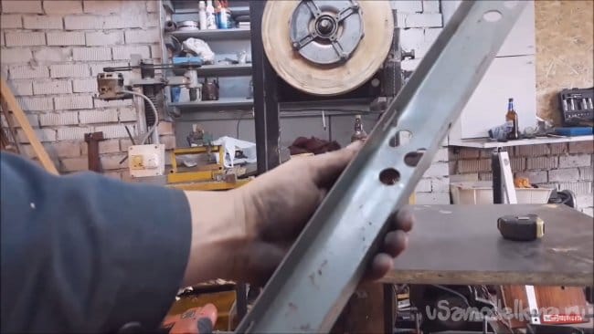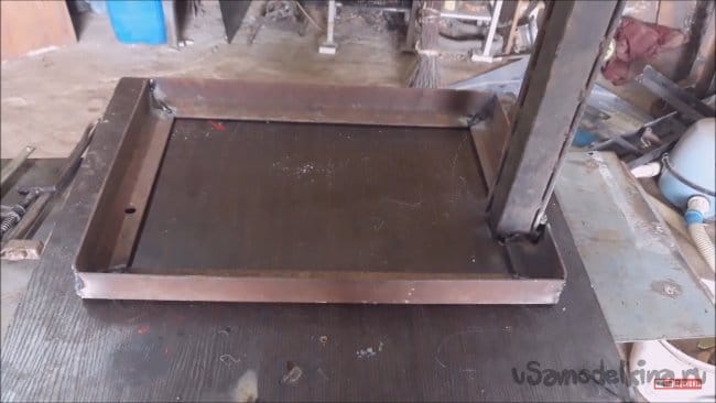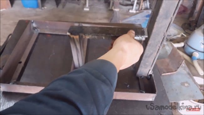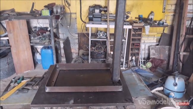 Из уголка 50×50 было сварено основание в форме прямоугольника. На одной из коротких сторон перпендикулярно была приварена стойка, состоящая из профильной трубы 40×40 и усиленная 50 уголком.
