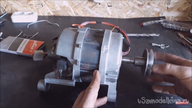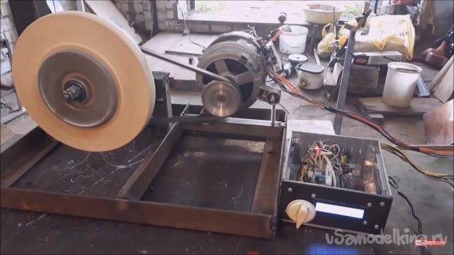 Колесо надевается на ось и упирается в выступ, с другой стороны, через шайбу затягивается гайкой и контрогается. Ось сначала прихватил сваркой, потом отдел колесо, к нему приложил уровень и выровнял его относительно рамы и вертикальной стойки. Потом ось окончательно была заварена. С одной стороны рамы временно установил мотор и накинул ремень. Мотор кстати от стиральной машинки автомат мощностью около 400 Вт. На канале есть ролик по изготовлению контроллера на базе Arduino для управления такими моторами. Этот контроллер позволяет регулировать обороты с поддержкой мощности. Также в скором будущем выложу сюда статью с подробнейшим описанием по сборке такого контроллера. Подождите немного. Включил всё это дело в розетку и потихоньку добавлял оборотов. Всё крутится, ничего не трясётся, подшипники не греются.