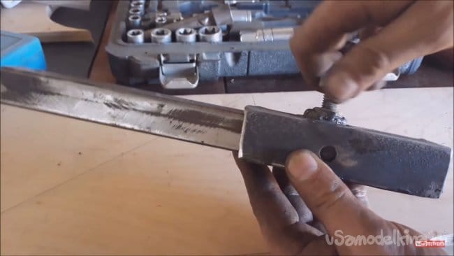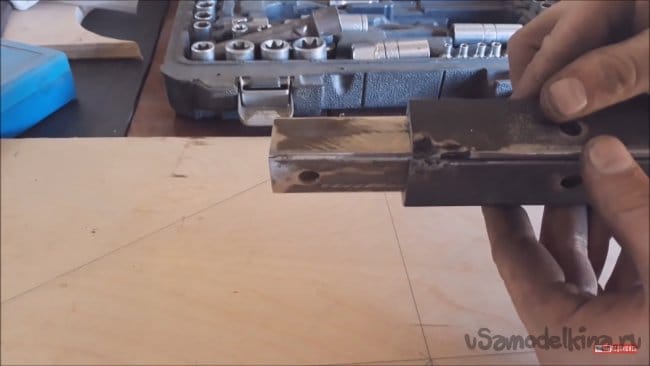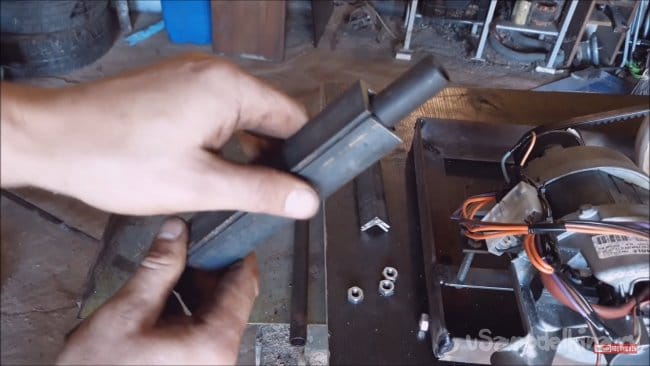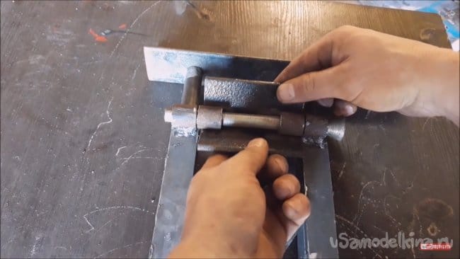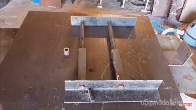 Взял два отрезка трубок длинной около 30 см. По торцам приварил гайки. В двух кусках 50 уголка на равном расстоянии просверлил отверстия и болтами прикрутил трубки. Получилось что-то вроде параллельных направляющих. Теперь из двух уголков варим что-то похожее на профильную трубу, предварительно вставив туда трубку. Получились подвижные элементы. Соединяем их перемычкой. Теперь из этой же трубы нарезаем 4 кусочка. Два из них привариваем по краям, внизу подвижной рамки, это важно, а оставшиеся два ввариваем внутри уголка.
