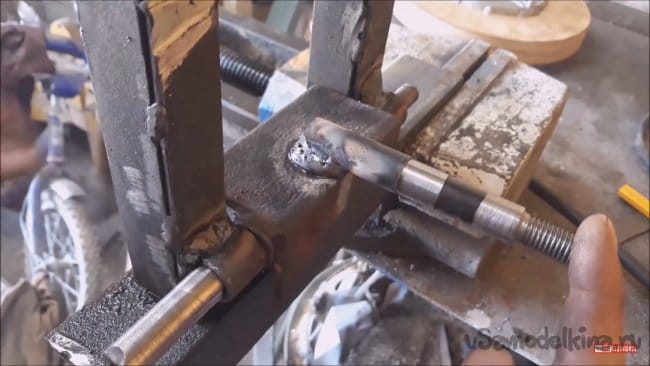 Все пилил по месту, поэтому точных размеров не скажу. На рамке посередине приварил поперечину, к ней небольшую стойку и верхнюю поперечину, к которой будет крепиться ось колеса. Думаю, на картинке всё будет понятно. Если чего не так, внизу под текстом будут ссылочки на видео, там можно будет всё подробно рассмотреть. К верхней поперечине ось решил тупо приварить. Кстати, оси вытачивал сам на своём тв-16. Ещё забыл сказать, что между крышками была установлена распорная втулка, изготовленная из водопроводной трубы. Подогнал диаметр оси под внутренний диаметр подшипников и с одного края нарезал резьбу.