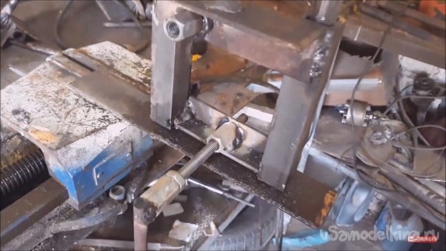 Через трубки продеваем подходящую ось. К этому подвижному уголку будет перевариваться ось верхнего колеса. Верх подвижной рамки тоже скрепляем уголком. Здесь будет просверлено отверстие и приварена удлиненная гайка. В неё будет вкручена длинная шпилька, которая будет проходить через верхний уголок. Там будут установлены шайбы и две законтрогаенные гайки сверху и снизу уголка. На шпильку накручена рукоятка. Это позволит перемещать каретку для натяжки. С обратной стороны каретки внизу также приваривается перемычка, просверливается отверстие и вкручивается болт. Он упирается в уголок с осью и позволяет регулировать наклон верхнего колеса. Как же тяжело это писать так, чтобы было понятно. Когда всё готово, эту конструкцию можно приварить к стойке. Я делал так. Верхний и нижний уголок, на которых держатся трубки, изначально брал длиннее, так как не представлял, как всё это вместе сложится. К торцам колес прикладывал уровень и выставлял колёса строго вертикально относительно стойки. То есть пильное полотно должно двигаться параллельно стойке. Далее отмечал верхний и нижний уголок и отрезал.