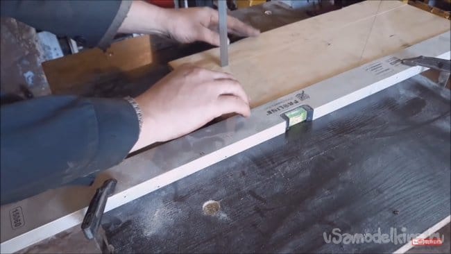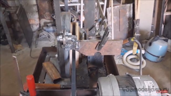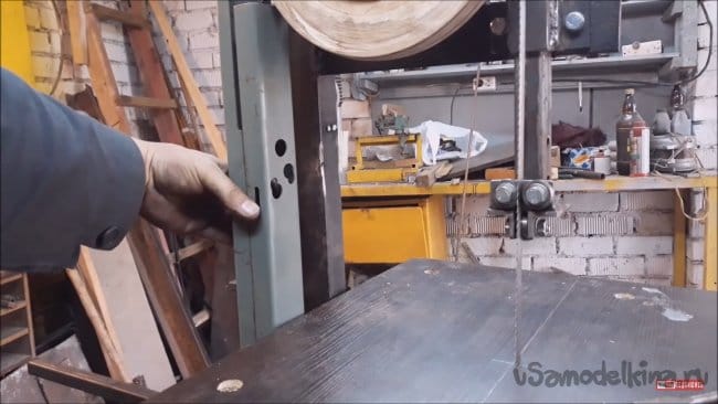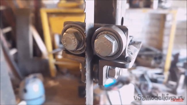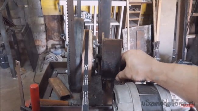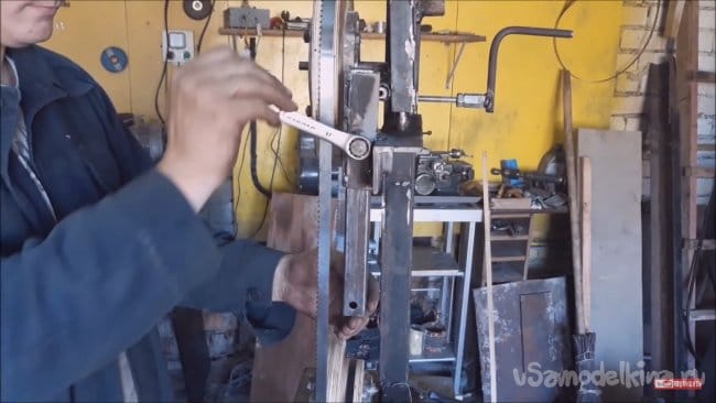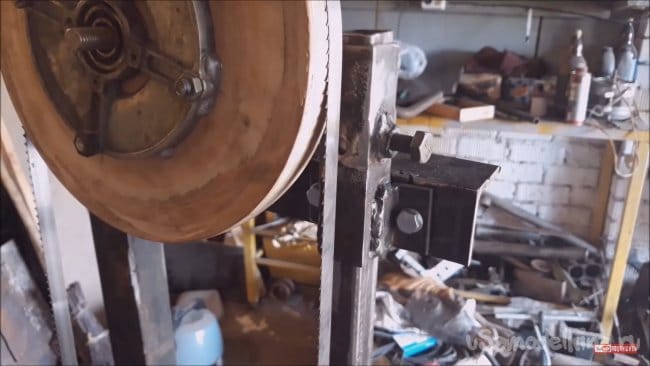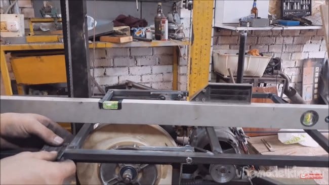 Теперь прикладывал уровень к торцам колес и фиксировал струбцинами. Я использовал уровень с одной стороны колеса, а с другой ровную рейку. Так мы добьемся положения колес в одной плоскости. Когда всё выставлено, можно приварить раму верхнего колеса к центральной стойке. После сварки можно накинуть пильную ленту и попробовать включить. Стоять лучше сзади станка, дабы не травмироваться. Перед пуском колёса обязательно прокрутить в ручную. Сначала лента будет сваливаться, но вы поймете, как её правильно отрегулировать. И только после того как она будет стабильно бежать посреди колеса, можно включить двигатель. Если всё хорошо продолжаем дальше . Если лента всё равно пытается слететь с колес, значит где-то неправильно сварили или не отрегулировали.