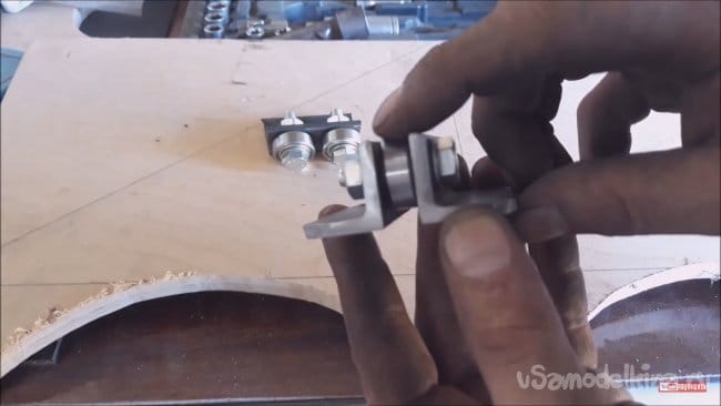 Теперь приступим к установке верхнего колеса. Здесь немного всё сложнее. Это колесо должно двигаться в двух плоскостях. В верх-вниз для того чтобы натягивать ленту и отпускать натяжку для её замены. Также колесо должно наклоняться. Это нужно для регулировки ленты, чтобы она бегала строго по центру колеса. Решение этой проблемы выглядело так.