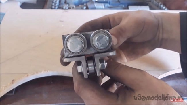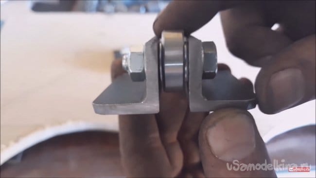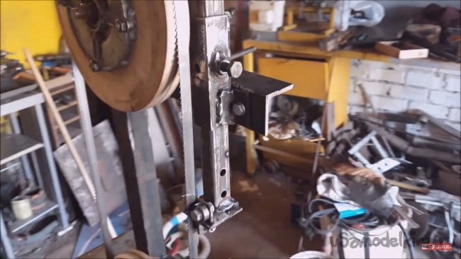 Теперь нужно изготовить узел, который будет удерживать ленту в нужном положении. Он состоит из трёх подшипников. Два из них удерживают ленту с боков, третий опорный. Он не позволяет ленте при пилении слететь с колес. Весь этот механизм я изготовил из трёх отрезков уголка. Просверлил отверстия и вставил туда подшипники с внутренним диаметром 8 мм. Они как раз хорошо садятся на болты М8 конструкция этого узла хорошо видно на фото. Отверстие под подшипники, которые удерживают ленту по бокам нужно делать овальными. Это позволит регулировать зазор. Также овальными нужно сделать отверстие для заднего подшипника. Весь этот узел должен быть подвижным, для регулировки высоты пропила. Его сделал по такому же принципу, как и подвижная каретка. Только вместо трубки была взята профильная труба. В наружном каркасе просверлил отверстие, приварил гайку и вкрутил туда болт. Он будет фиксировать штангу в нужном положении. Так же к корпусу приварил два уголка с отверстиями. Вся эта конструкция крепится к нижнему уголку верхнего колеса. Отверстия специально были сделаны большего диаметра, что позволило весь этот механизм отрегулировать. Ещё к этому механизму крепится уголок, который закрывает ленту. Он выполняет защитную функцию. Такой же подшипниковый узел был установлен возле нижнего колеса под столом. Приварил его к толстой пластине. Он неподвижный.