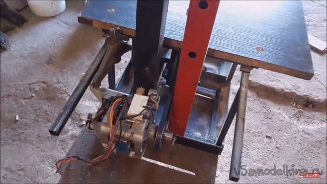 С левой стороны лента бежит вверх и тоже открыта. Под руку попался п-образный профиль. Из двух кусков собрал короб и закрепил к вертикальной стойке. Короб скручивается болтиками. Внутри находится лента. Безопасность важна. Дальше я изготовил стол. Каркасом для него послужила труба 15×15. Учтите, что каркас стола нужно делать разомкнутым, чтобы можно было заменить ленту. Рамку решил делать наклонной, поэтому двигатель из-под стола перекочевал на другую сторону. Благо переварить крепление нетрудно. На каркас стола накинул лист ДСП, предварительно сделав пропил, чтоб продеть полотно. В конце пропил немного расширил для исключения зажима пильного полотна. Стол прикрутил к рамке винтами с потайной шляпкой. Для верхнего колеса изготовил фанерный короб. На него крепится коробка с платой управления двигателем.