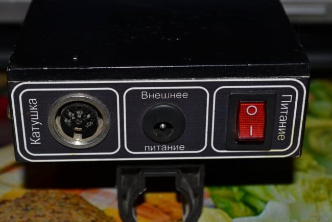 На задней панели — выключатель питания, разъем внешнего питания и разъем катушки. В качестве разъема катушки был использован так называемый советский аудио разъем, а если точнее DIN5. Но не обычный ширпотребный, а качественный разъем польской фирмы TESLA, с ответным штекером того же производителя.