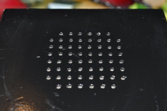На верхней крышке насверлил решетку для динамика. Сделал я это очень просто: взял тетрадный лист в клеточку, нарисовал радиус, приклеил к заготовке и насверлил по клеткам в пределах радиуса.