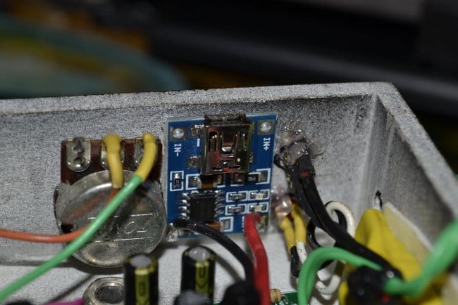 Заряжаются аккумуляторы через ширпотребный модуль заряда. К сожалению удобного места в корпусе для него не осталось, так что для зарядки нужно отвинтить крышку, что бы произвести зарядку. Возможно позже я это исправлю, например повешу зарядку на гнездо внешнего питания.