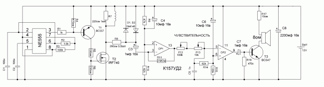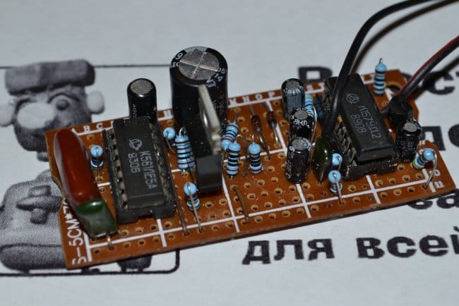 Первый вариант детектора я собрал из того, что было под рукой на макетной плате. Схема собрана на микросхемах К561ЛЕ5А и К157УД2. Крайне желательно использовать именно К157УД2, так как именно под нее создавалась схема. Безболезненно, без потери чувствительности её можно заменить на УД3 — малошумящую версию этой же микросхемы. Достать эту микросхему можно почти в любом советском магнитофоне или аудиотехнике, я выпаял жменю из старого микшера. Если же уже совсем никак и решите собирать схему на TL072, широко гуляющую в сети, советую заменить его на что-то покачественнее, по типу JRC4558 или NE5532. Генератор же проще собрать на таймере NE555, у меня его просто не оказалось.
