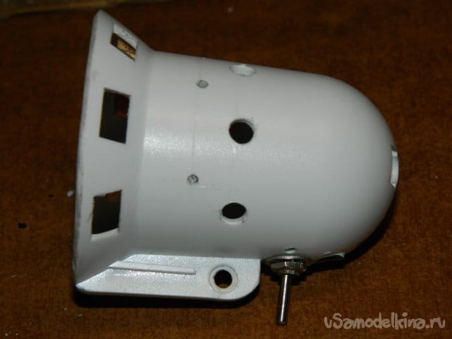С противоположной стороны выфрезеровал место под микротумблер SMTS-102-2A2 и, просверлив сбоку плафона отверстие ø5 мм, установил его. По бокам плафона насверлил отверстия для охлаждения, а также сделал резьбовые отверстия для крепления сборки светодиодов.