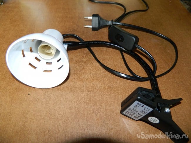 А если привязать лампу к рабочему столу? Тогда лампа будет светить на место сверления независимо от положения постоянно. В магазине были приобретены лампы с гибкой ножкой на прищепке по 155 руб. за штуку, рассчитанные на лампу Е14.