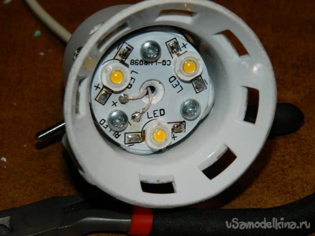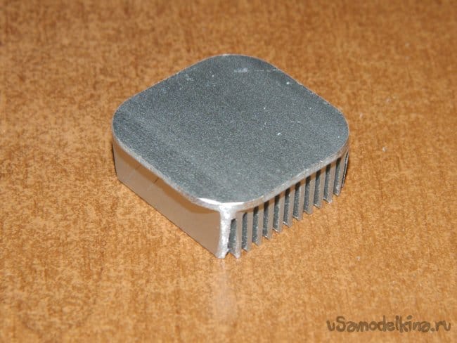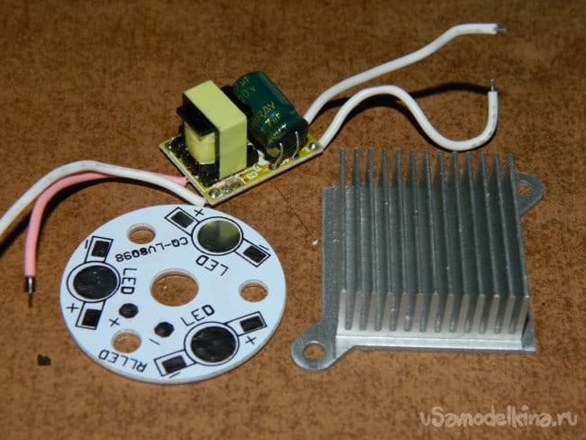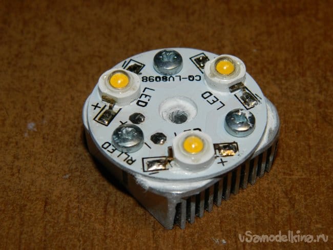 Теперь займёмся конкретно с модулем. Подготовка радиатора свелась к тому, что были отпилены ушки и напильником скруглены углы, чтобы радиатор поместился в плафон.