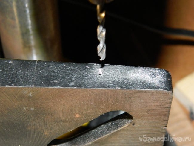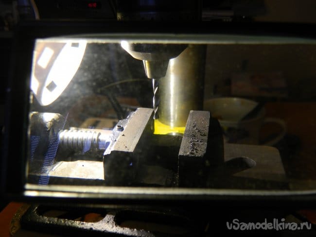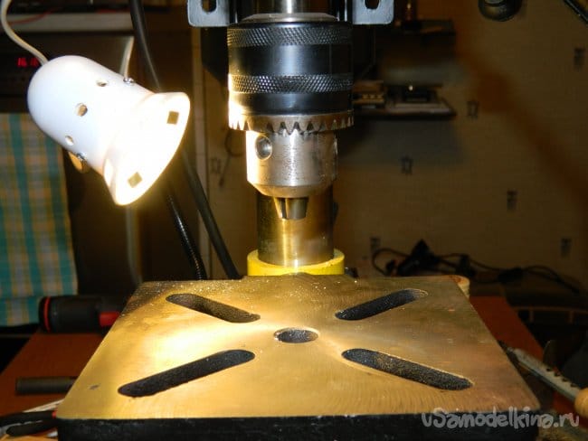 Теперь следовало закрепить лампу на столике станка. Сняв столик, просверлил в бортике отверстие ø3,5 мм и нарезал в нём резьбу М4.