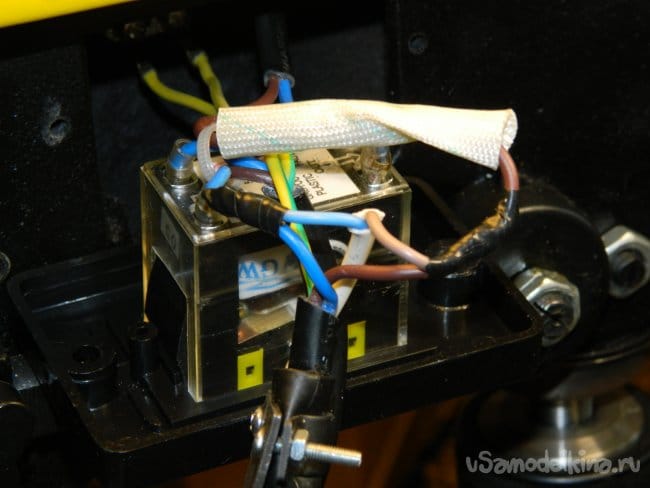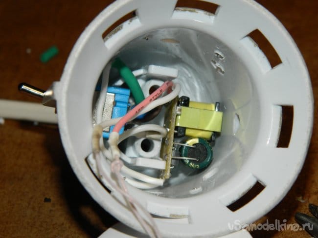 Монтаж всей проводки делал проводом МГТФ 0,2 мм². Подпаялся проводами (которые должны были питать лампу) к тумблеру и закрепил винтом (в лампе уже было предусмотрено такое крепление). Входные провода от драйвера, естественно, подпаял к выходу тумблера. На выходном «+» проводе драйвера завязал узелок (так как нарастил их проводом МГТФ).