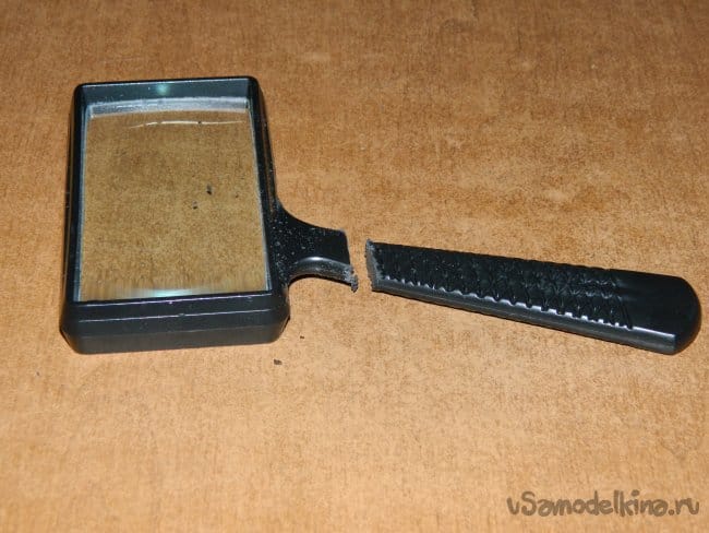 Переделывать, так до упора («мартышка в старости слаба глазами стала»)! Появилась идея установить ещё и лупу на гибкой ножкой. Лампа с ножкой у меня была — дело за лупой. В оптике я приобрёл прямоугольную лупу Х3 на ручке (за 340 рублей). Отрезал от неё часть ручки,