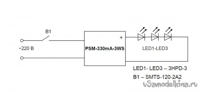 Ориентировался на 3-х ваттные светодиоды — (хотя они и будут работать в одноваттном режиме). Чип у этих светодиодов больше (45 mil) и, следовательно, в замкнутом пространстве они подвержены меньшему нагреву, а значит большей стабильности. На рисунке представлена схема подключения этих светодиодов к драйверу.