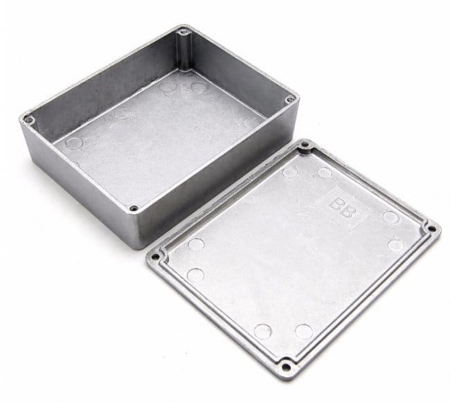Следует отметить, что от пластиковых такие корпуса отличаются большей устойчивостью к повреждениям и открытому огню, кроме того, алюминиевые корпуса являются отличными теплоотводами, так что их применение будет куда более оправдано в «горячих» проектах, например, для всевозможных усилителей.