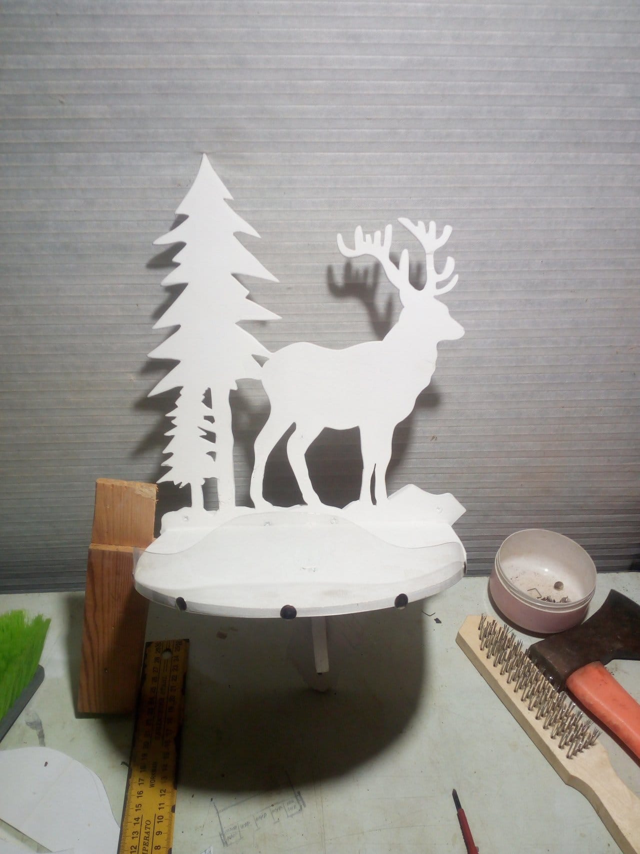 Посмотрев на то, что предлагает в этом случае интернет (делать что-то на подобие доска-доска-перекладина=полка мне не хотелось. Не интересно это), остановил свой выбор на полке, которая выглядит как застывший кусочек пейзажа. Олень в окружении елей. Перерисовав картинку на бумагу, наклеил ее на фанерную заготовку с помощью клея ПВА. Дав хорошенько высохнуть и приклеиться к деревянной поверхности, приступил к выпиливанию основной части конструкции. На электрический лобзик установил пилку с маленькими зубчиками, чтобы края фанеры были не сильно рваными. Там, где была необходимость в выпиле внутри картинки, делал отверстия шуруповертом, сверло которого должно быть по диаметру больше ширины пилки. Конечно, с некоторыми элементами, в частности с рогами оленя, пришлось повозиться, т к такой лобзик не очень предназначен для выпиливания особо мелких и заковыристых деталей. Но все таки все получилось нормально. всю заготовку тщательно шлифую. торцевые части зачищаю с помощью наждачной бумаги. Рога и внутренние выемки обрабатывал надфилями, потому что шкуркой не подлезть. Да и ими очень удобно придавать нужную форму. Лобзиком не везде смог выпилить точно по контуру. Пилка для таких работ не предназначена.