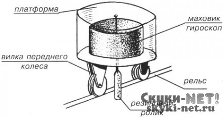 Устойчивость ей придает гироскопическое свойство маховика. Его раскручивают при помощи нити. На одной оси с ним — резиновый ролик, который прижат к рельсу. Он то и создает тягу.