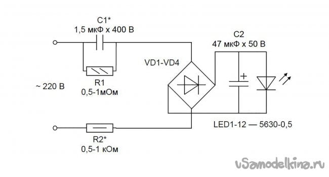 Если посчитать ток, протекающий через светодиоды по формуле I=(C1 * (U-U₁))/3,18 , где I — ток в mA; C1 = 1,5 мкФ; U = 220 В; U₁ — падение напряжения на светодиодах (3 В х 12 = 36 В), то мы получим 87 mA. Если максимальный ток через светодиоды 5630-0,5 равен 150 mA, то при данном токе охлаждения модуля не потребуется.