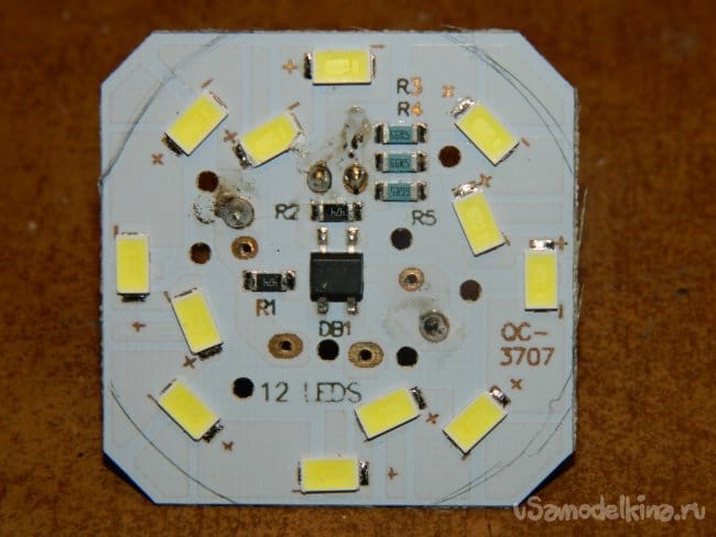 Светодиодный модуль представляет из себя прямоугольную пластину — 42х42 мм с напаянными на неё 12-ю светодиодами типа 5630-0,5, соединёнными последовательно.