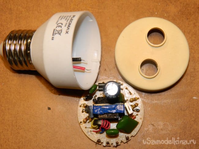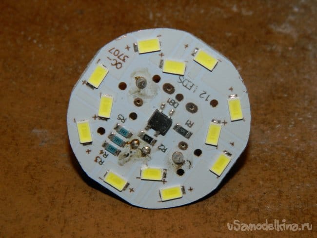 Он выполнен из стеклотекстолита. На лицевой стороне SMD-компоненты — расположен диодный мост и резисторы. С обратной стороны расположен металлопленочный конденсатор (который задаёт ток через светодиоды) и электролитический (для сглаживания пульсаций.