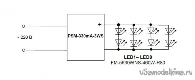 Так как выдерживают светодиоды max 150 мА, а материал платы стеклотекстолит, решил не рисковать, а дать половину мощности.