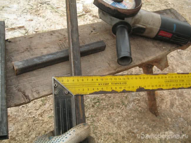 Заготовки разметил, отрезал тонким абразивным диском УШМ. Здесь было бы уместно устройство вроде маятниковой пилы. Для более перпендикулярного реза квадратной трубы разметил столярным угольником и карандашиком каждую ее грань. Резал так же. Каждую грань по очереди. Долго, но так несколько уменьшается неровность края.