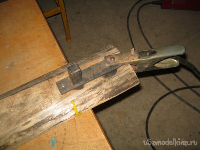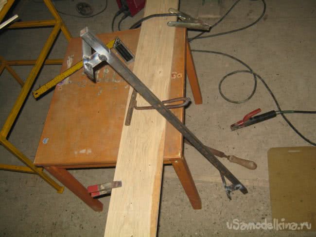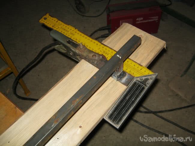 Приступил к сборке штанги. Как основание для сборки использовал не слишком ценную но ровную доску достаточной длины. На ней можно сделать сборку железки на прихватках, а сварку основательную, делать на весу. Конечно, здесь был бы уместнее сварочный стол и некоторые специализированные приспособления для сварки, например, магнитные уголки.