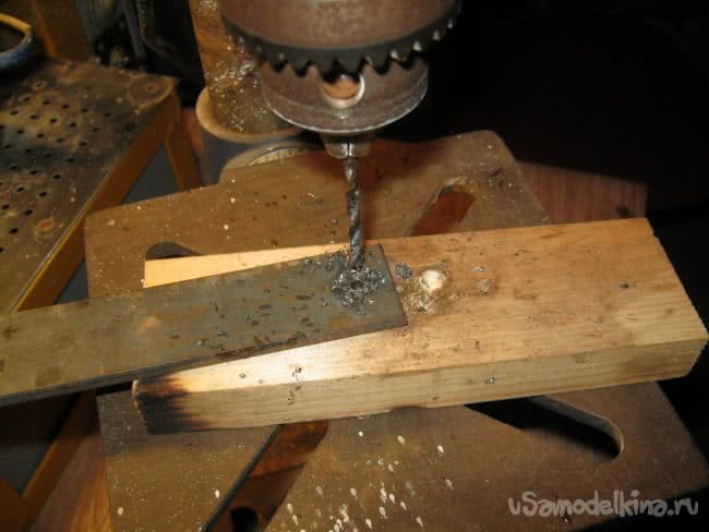 Притупил острые края заготовок на точиле. В заготовках кронштейнов разметил, накернил и просверлил отверстия для саморезов, отверстия зенковал сверлом крупного диаметра.